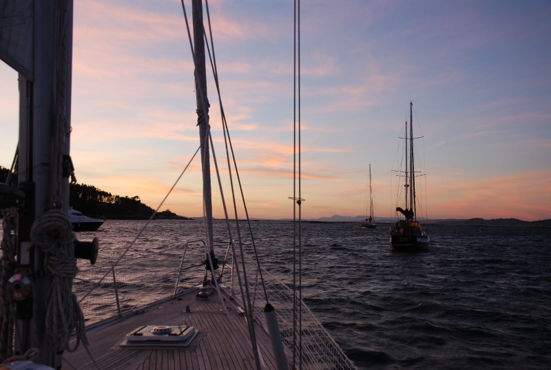 Ria de Arosa, waar Aguino te veel swell had en waar we uitkwamen bij Riveira (anker, 4e kermis en dus herrie). Pta de Cabio (anker), heerlijk zwemmen en rotsen beklimmen, Vilagarcia (haven) met bezoek aan stad en speeltuin. Pta Caballo (anker) op advies van locals, een prachtige afgelegen ankerplek. Van Sanxenxo (anker) naar Combarro (haven), een oude vissershaven die je niet mag missen wat ons betreft. Een heerlijke avond zeiltocht naar Ria de Aldan. Drie prachtige stranddagen met vele Spanjaarden voor anker en een Engelse zeilboot die op de (onderwater) rotsen liep (gelukkig met goede afloop), grote Rissos Dolphins die met ons de Ria uitzwommen naast de boot, richting Isla Cies.