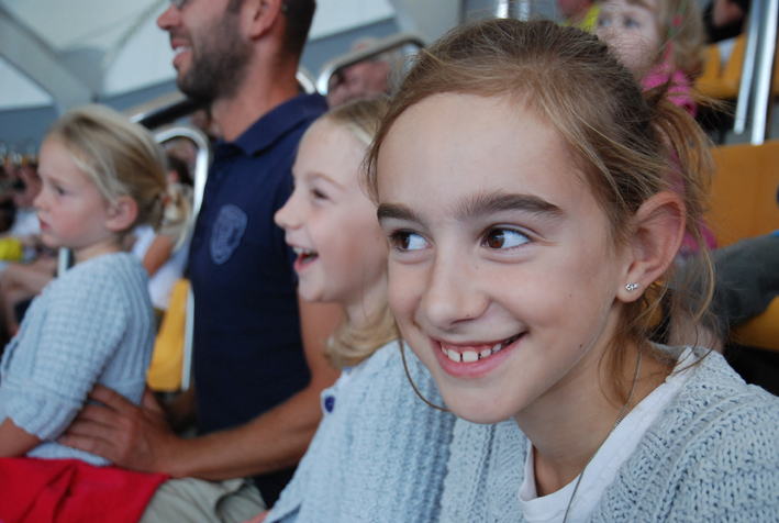 De oversteek was leuk maar soms lang en af en toe verveelde ik me. Dan ging ik DSi-en of computeren (Tom en Tamira). Maar het was bijzonder om zolang samen te zijn en we hebben ook veel spelletjes gedaan, naast school. We hebben jagende dolfijnen gezien, maar geen orka’s of walvissen. De oversteek was bijzonder, maar ik zou het liever niet nog een keer willen doen. Op de foto bel ik met de Iridiumtelefoon (dit is een satelliettelefoon), naar Opie en Omie dat we er bijna zijn… Dag dag!