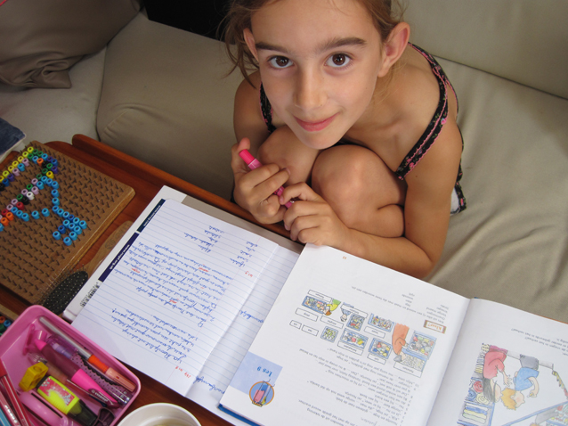 School: Ik heb een eigen schoolvlag dat mijn vriendinnen en vrienden zien dat ik school heb. Dus komen ze niet vragen of ze kunnen spelen. Ik weet ook hoe ik naar school moet lopen. En dat doe ik zo: een keer om de mast lopen. En dan met mijn vinger op mijn neus twee keer op het dek springen. Zo loop ik naar school. Ik werk minder dan jullie. Omdat ik geen topografie, info, en al die projecten heb.